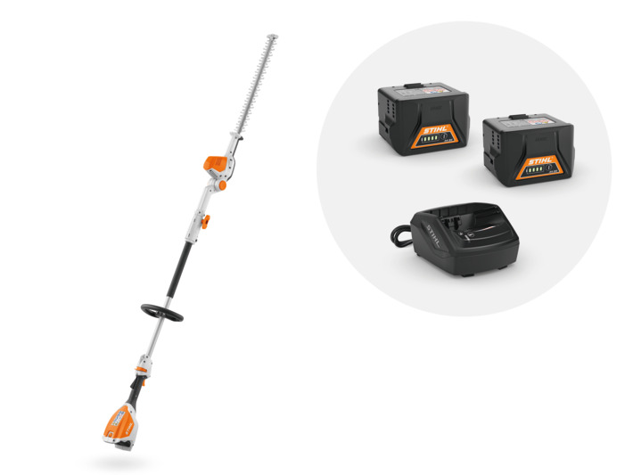 Lekkie akumulatorowe nożyce do żywopłotów na wysięgniku do cięcia wyższych żywopłotów i krzewów w ogrodzie. Listwa tnąca z jednostronnie szlifowanymi zębami w kształcie kropli, kąt nachylenia regulowany stopniowo w zakresie od -45° do +90°, po dzielny wysięgnik ułatwia transport. Długość transportowa 115 cm, długość całkowita 210 cm. Zestaw 2 x AK 20 i AL 101.